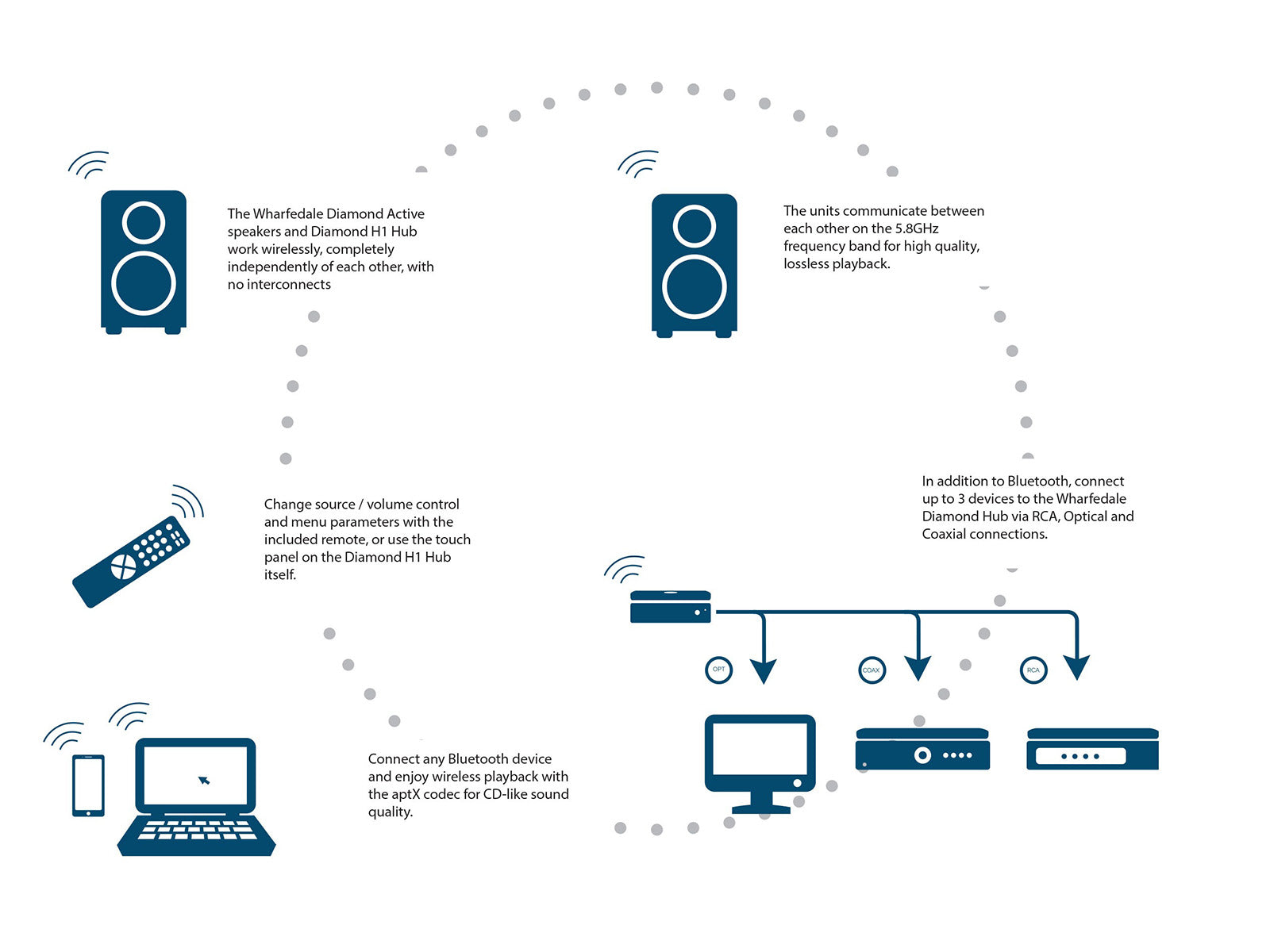Wharfedale Diamond Active Series couple innovative, convenient wireless technology with an award-winning loudspeaker formula for tremendous bass delivery and scintillating high frequencies.