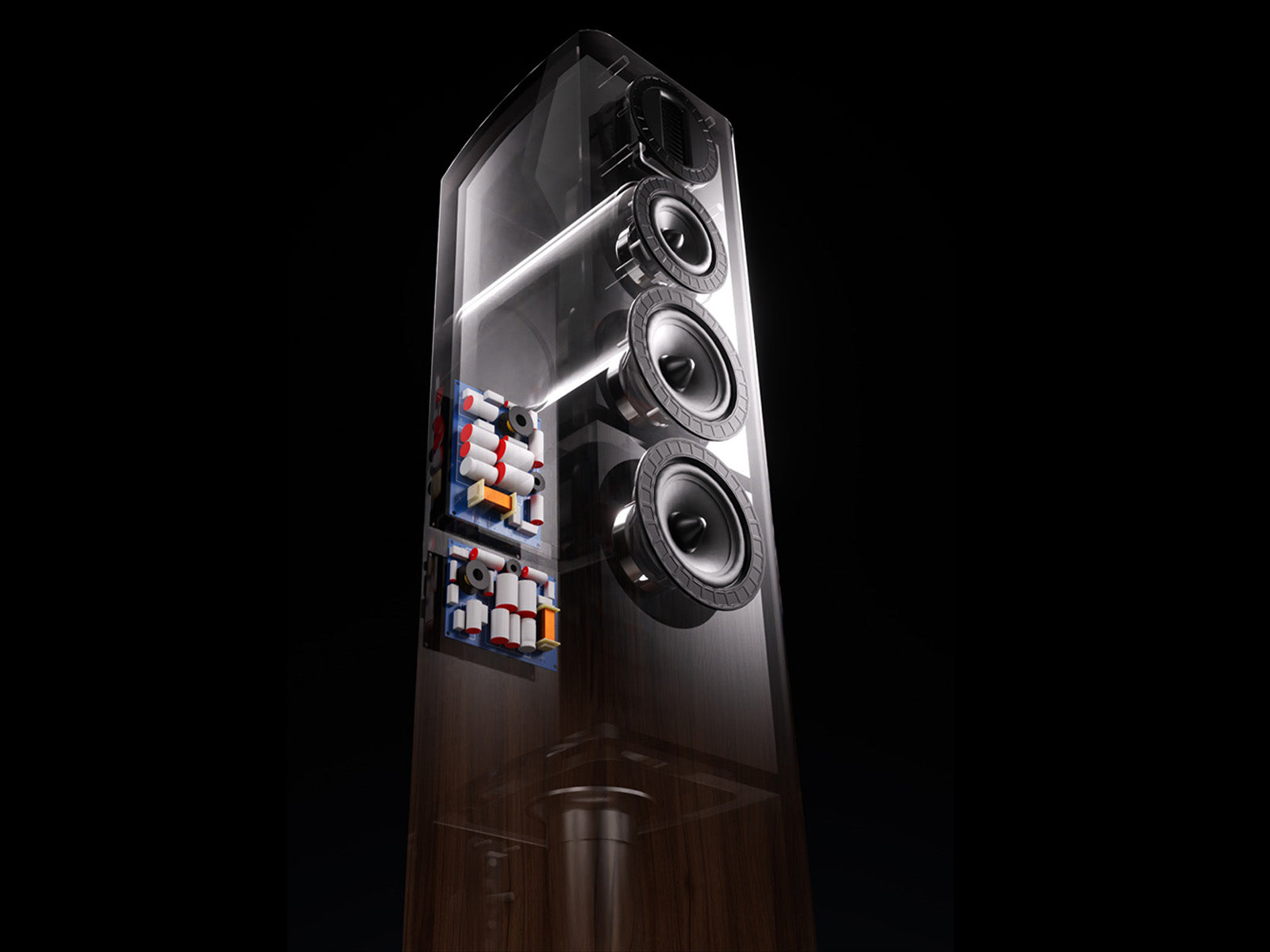 AURA cabinets are, in many ways, a work of art. Available in Black, White and a feature-grained Walnut natural wood veneer, each cabinet is then lacquered and polished to present a beautiful piece of furniture you will be proud to have in your home, akin to that of the significantly higher priced ELYSIAN series. The smooth curves of the cabinet are more than just eye-catching. They help to disperse the acoustic output of the drive units smoothly into the room without undesirable reflections from otherwise sharp edges.