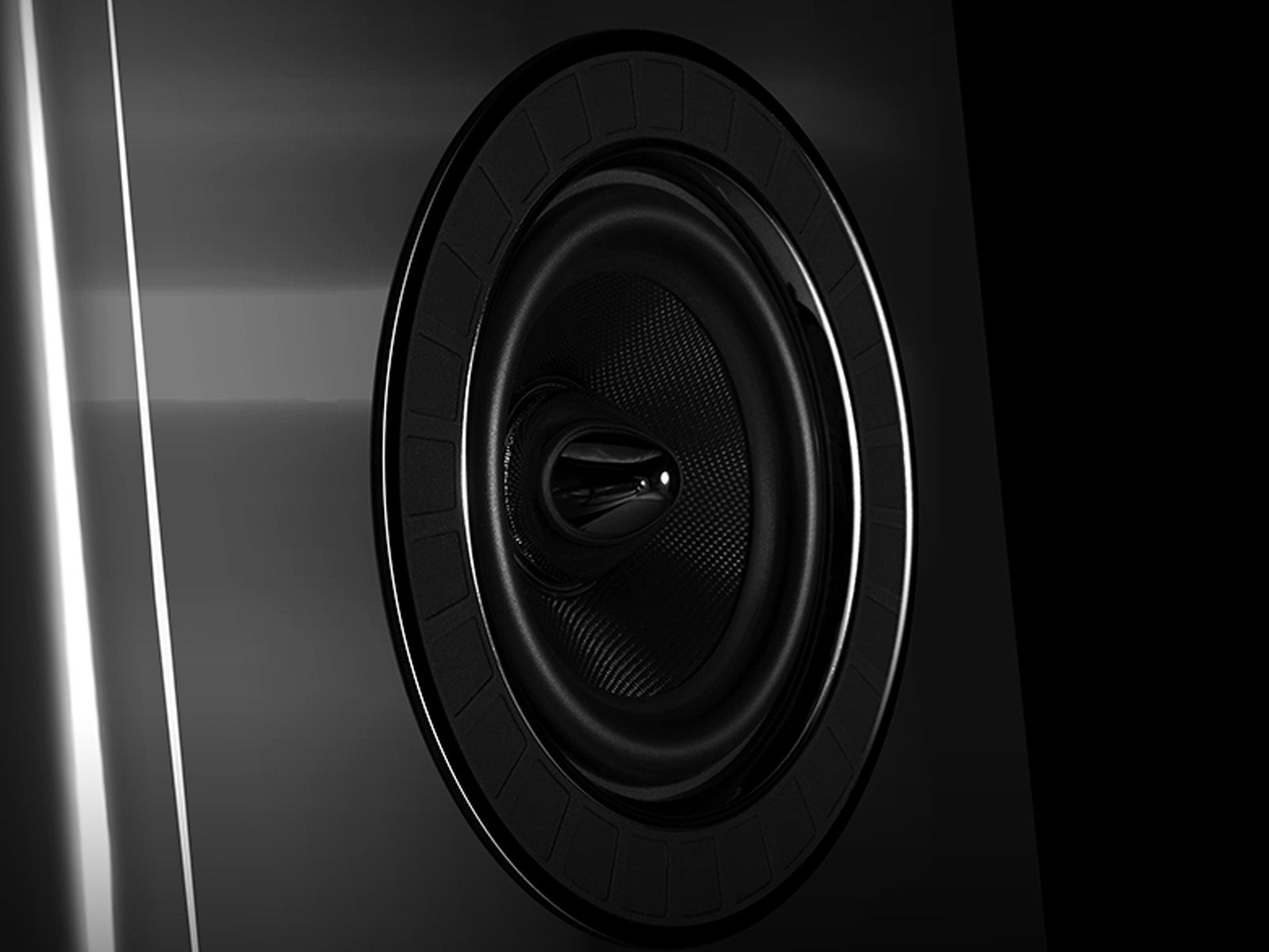 These low-distortion motor systems are mounted on die-cast aluminium chassis, each fixed to the cabinet by six high-tensile bolts to maintain the rigidity of the structure and provide an accurate transient response. The rubber trim rings surrounding each chassis are not just a decorative feature but also control any resonance occurring at the junction of the aluminium chassis and wood cabinet.
