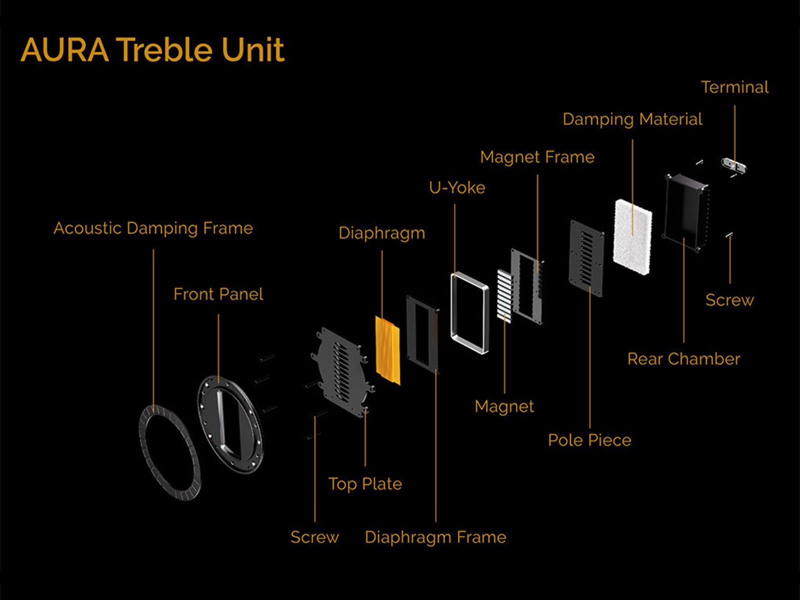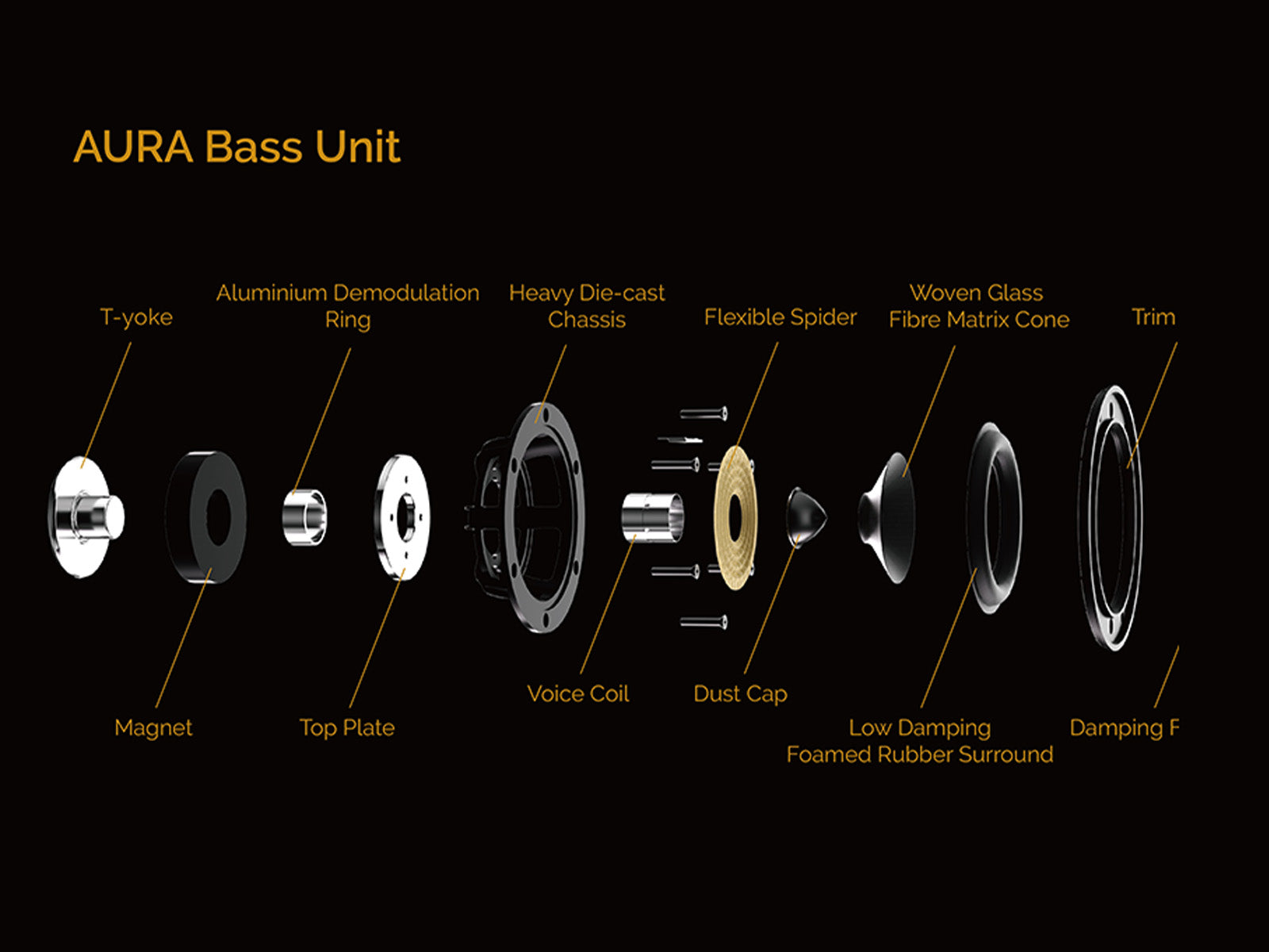 As Wharfedale engineers found when designing the flagship ELYSIAN series, the transient accuracy and efficiency of the AMT need to be matched by the midrange and bass drivers for a seamless audio performance. Accordingly, AURA also uses a proprietary woven glass fibre matrix diaphragm for the midrange and bass cones terminated by high-flexibility rubber surrounds. The voice coils driving the cones are immersed in high flux magnetic fields, with eddy currents and inductance controlled by copper-clad pole pieces.