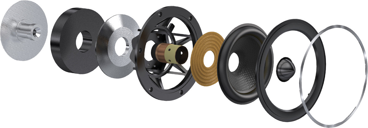The driver assembly is mounted in a specially designed basket with a network of ribs to increase rigidity, thus improving transient impact. A large open area behind the cone reduces early reflections and allows the internal cabinet absorbent to do its work.