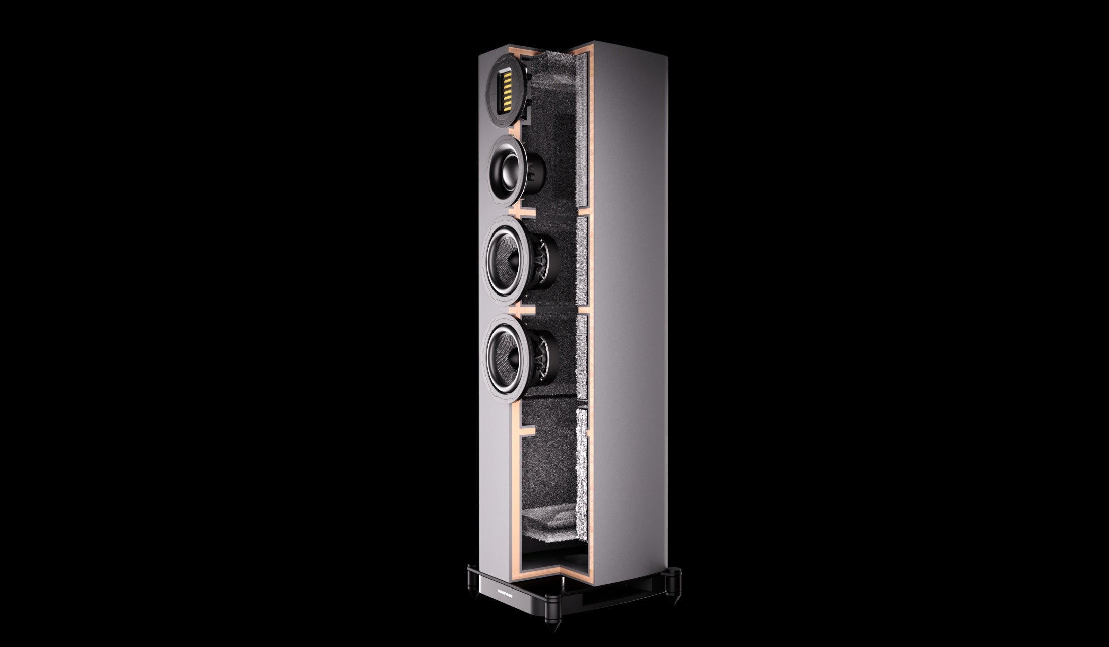 Each cabinet is built from a sandwich of woods of different densities, designed to reduce panel resonance to below audibility. This multi-layer construction also inhibits the leakage of unwanted sound energy from inside the cabinet, which would otherwise interfere with the forward output of the drive units. The baffle’s radiused edges smooth the flow of sonic energy around the cabinet, helping to integrate the drivers’ output with the room acoustics.