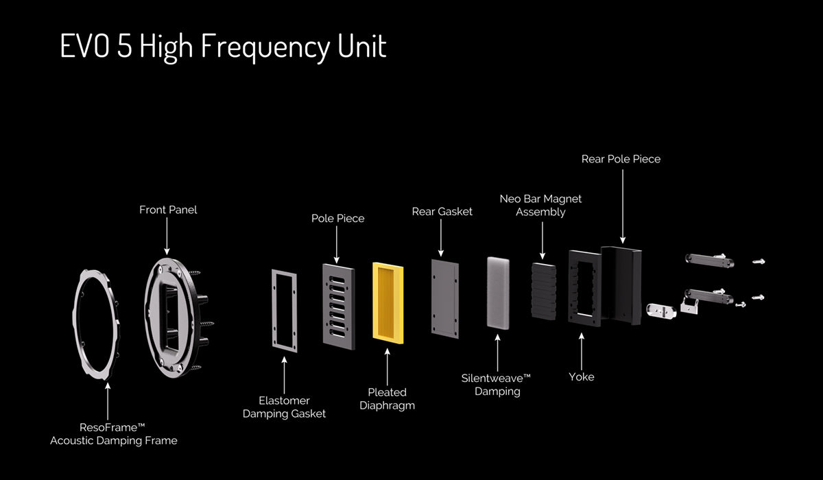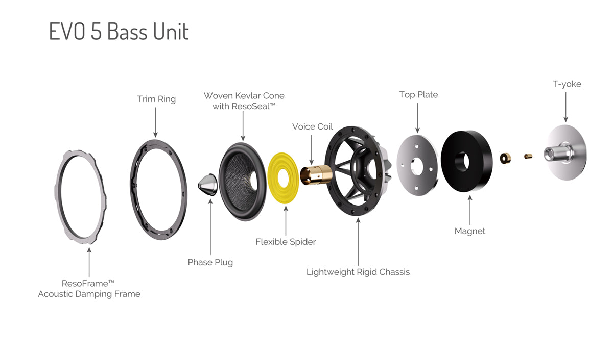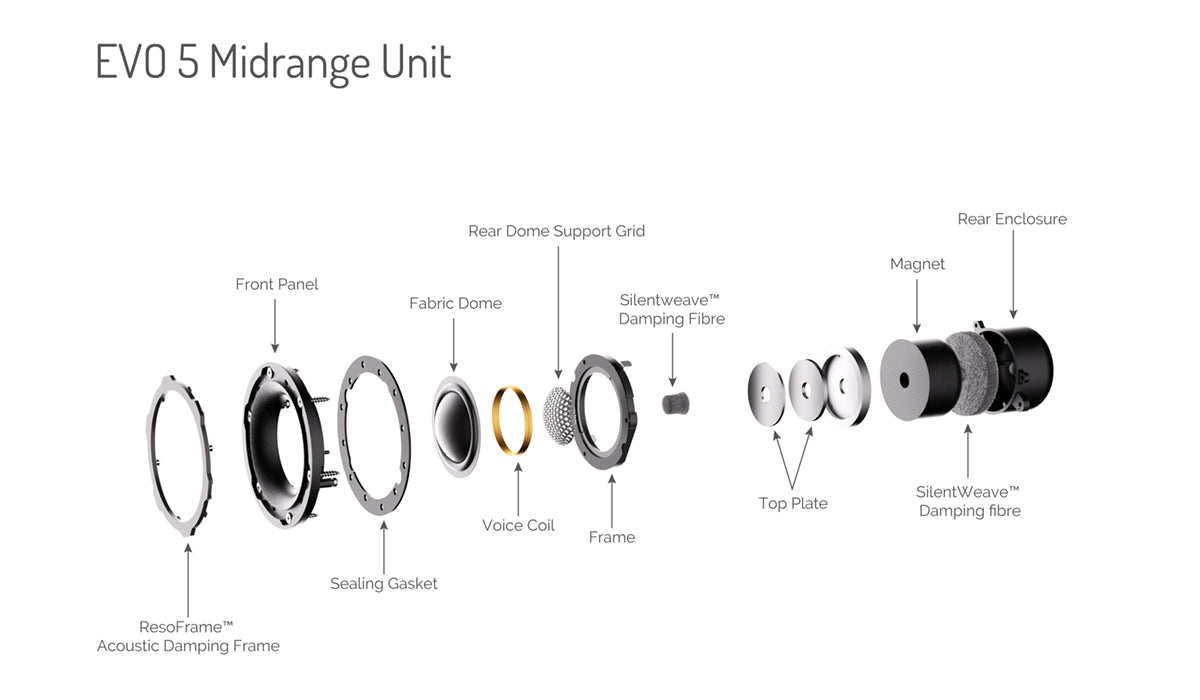 The EVO 5 version of this drive unit benefits from several acoustic upgrades, including a ResoFrame acoustic damping frame within the driver’s front panel, and SilentWeave material in two places: behind the diaphragm and voice coil and in front of the rear enclosure. As with the AMT unit, these elements reduce resonances and soundwave reflections to deliver a smoother response and improved clarity.