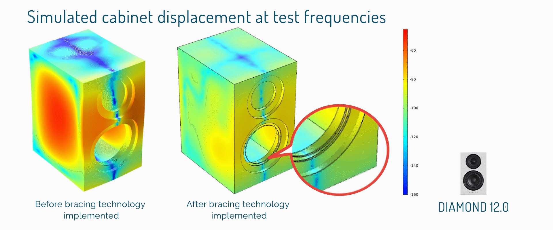 Inside the cabinet, Intelligent Spot Bracing connects opposite walls with a specific form of the wood brace to achieve an optimal reduction of cabinet resonance. These braces are precisely modelled by computer simulation to improve upon the commonplace ‘figure of eight’ brace, which may simply transfer resonance from one wall to another.