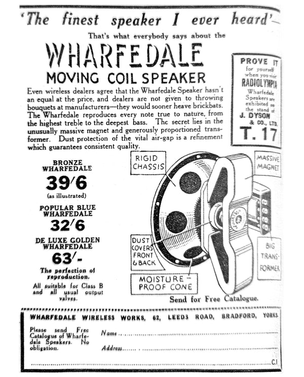 Wharfedale was founded in 1932 by Gilbert Briggs, a music enthusiast and amateur engineer. He built his first loudspeaker in the cellar of his home in Ilkley, Yorkshire. The location, nestled in the valley of the River Wharfe—an area known as Wharfedale—inspired the brand name.