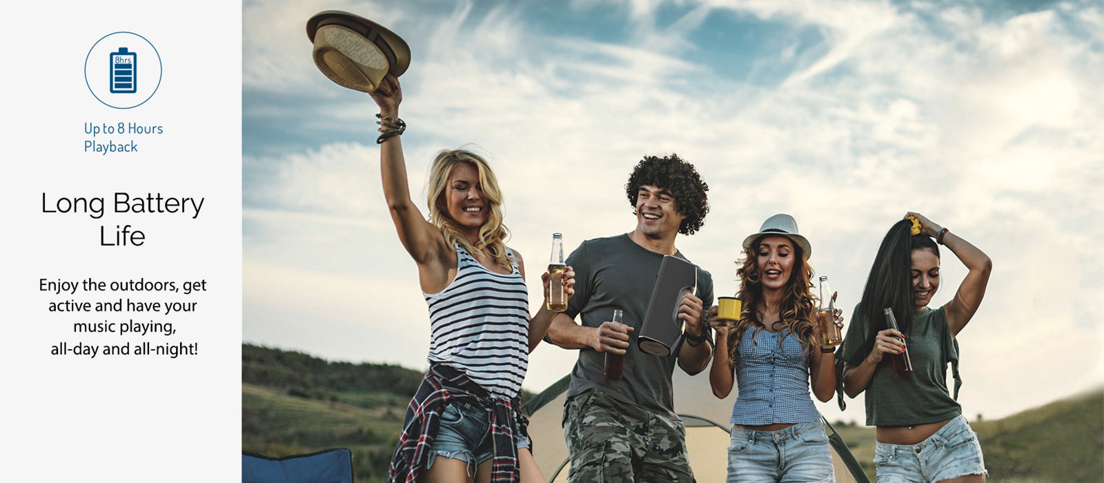 The stylish, shockproof rubber exterior is combined with an IPX7 waterproof rating, thus making it possible to survive the harsh outdoor elements, including submergence in water and covering in sand or dust!  A built-in 2500mAh rechargeable battery offers up to 8 hours of playtime as well as allowing you to charge your phone or tablet devices on the go, thanks to power bank functionality.