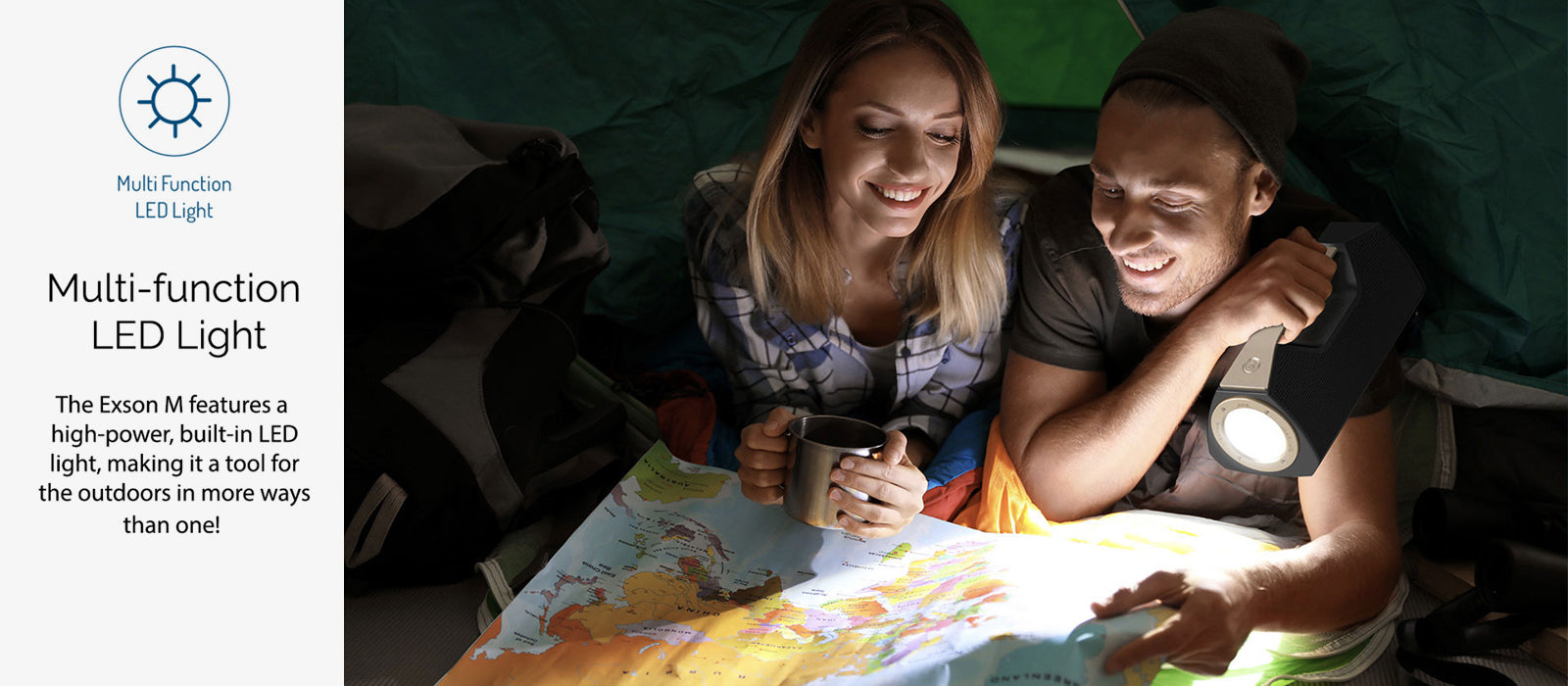 For the true adventurer, the Wharfedale Exson M also uniquely features a high-power LED flashlight functionality.