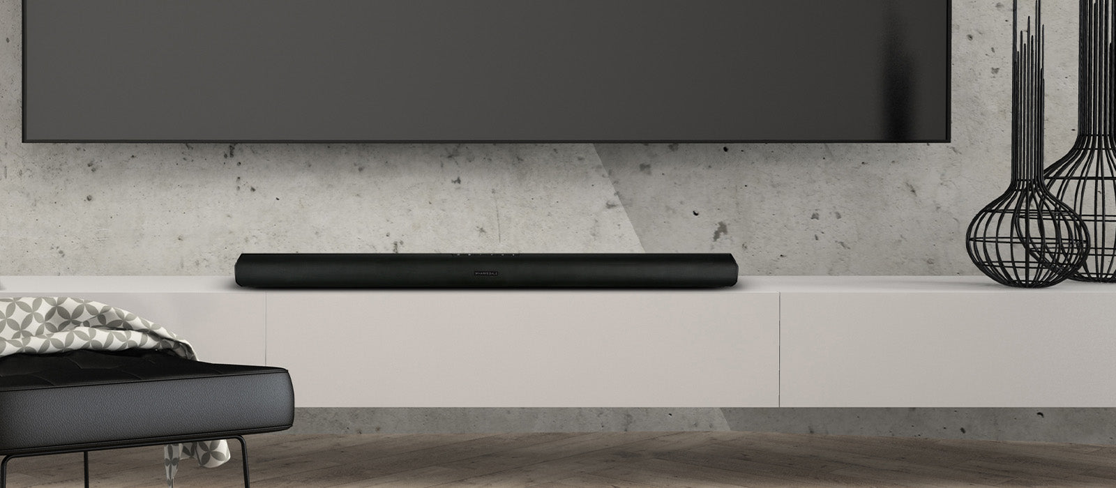 Nestling behind the metal speaker grille is a pair of high-quality dynamic driver assemblies, positioned at either end of the soundbar’s length to ensure spacious stereo sound and augmented by two reflex ports to aid bass response. These drivers are powered by 2x30W stereo amplification, producing a sound that is crisply detailed yet tonally rich – a powerful, highly intelligible delivery that ensures voices are clear, sound effects are impactful, and music is full-bodied and engaging. In addition, three equaliser settings labelled ‘Movie’, ‘Music’ and ‘News’ provide a degree of sonic tailoring to suit whatever the user is watching or listening to.